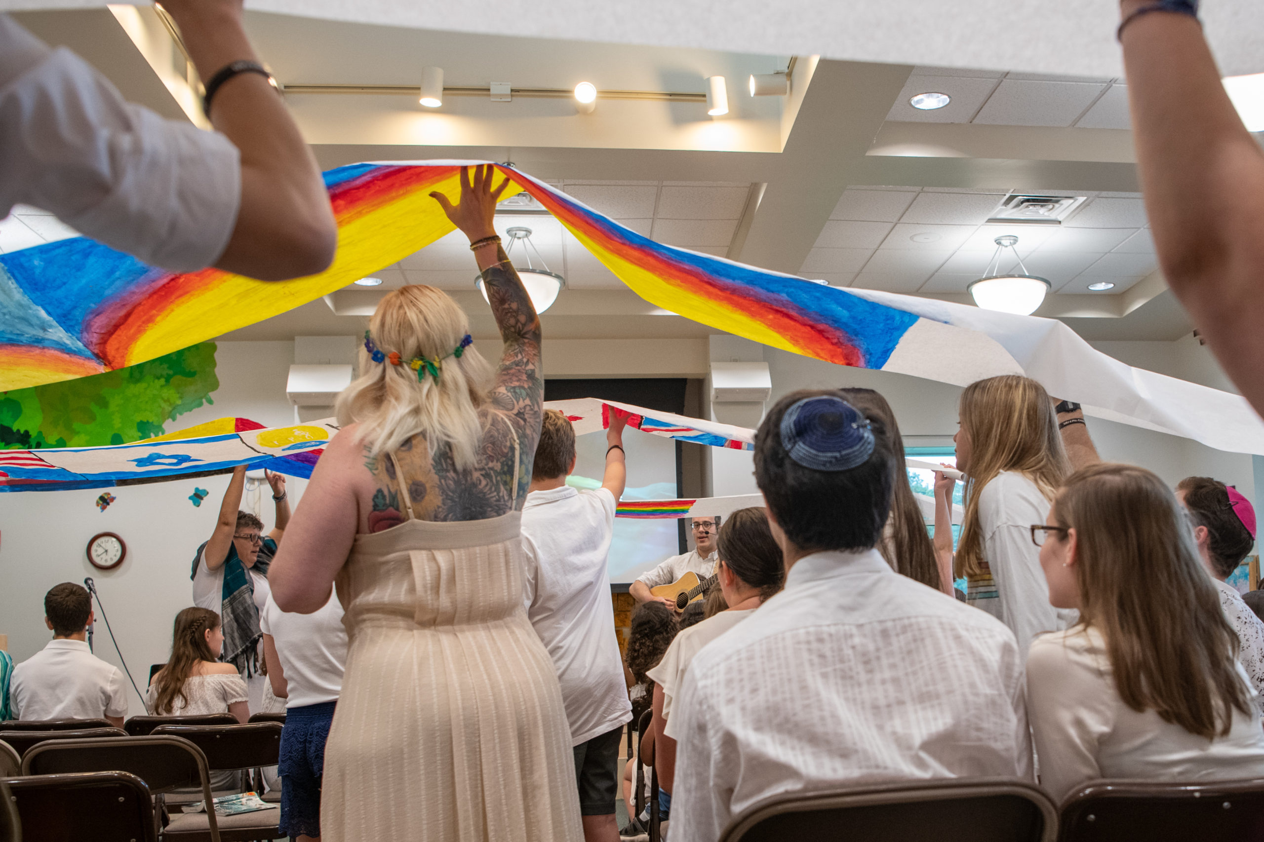 On one panel were the Wings of the Divine Presence and the Hebrew text of one of the prayers. On another were the flags of the US, Israel, Canada, and Great Britain—the countries from where our community comes. On the third were a sunset and sunrise, expressing the movement from evening to morning. And on the fourth were the pride flags, a recognition of the inclusive attitude we have at camp, as well as a painted prayer for the world at large.
